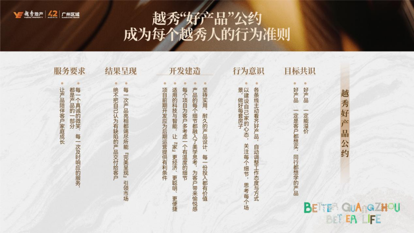 打造好房子是房企的基本功,而树立优秀的产品观则是其使命所系。费柳天强调,真正的好房子,审美必须在线,既能承载本土文化底蕴,又能呼应时代精神,面对“建设好房子”如此宏大的课题,要持续提供牵引力、且不断提速,离不开全公司的高度共识。为此,“越秀好产品公约”成为每一位越秀人恪守的产品行为准则。